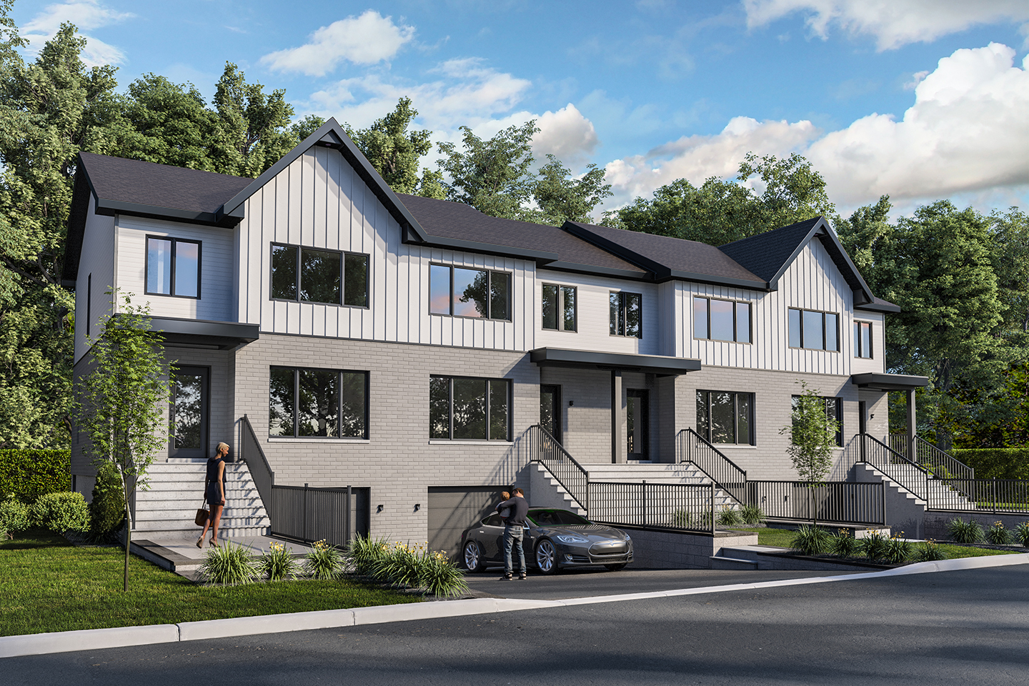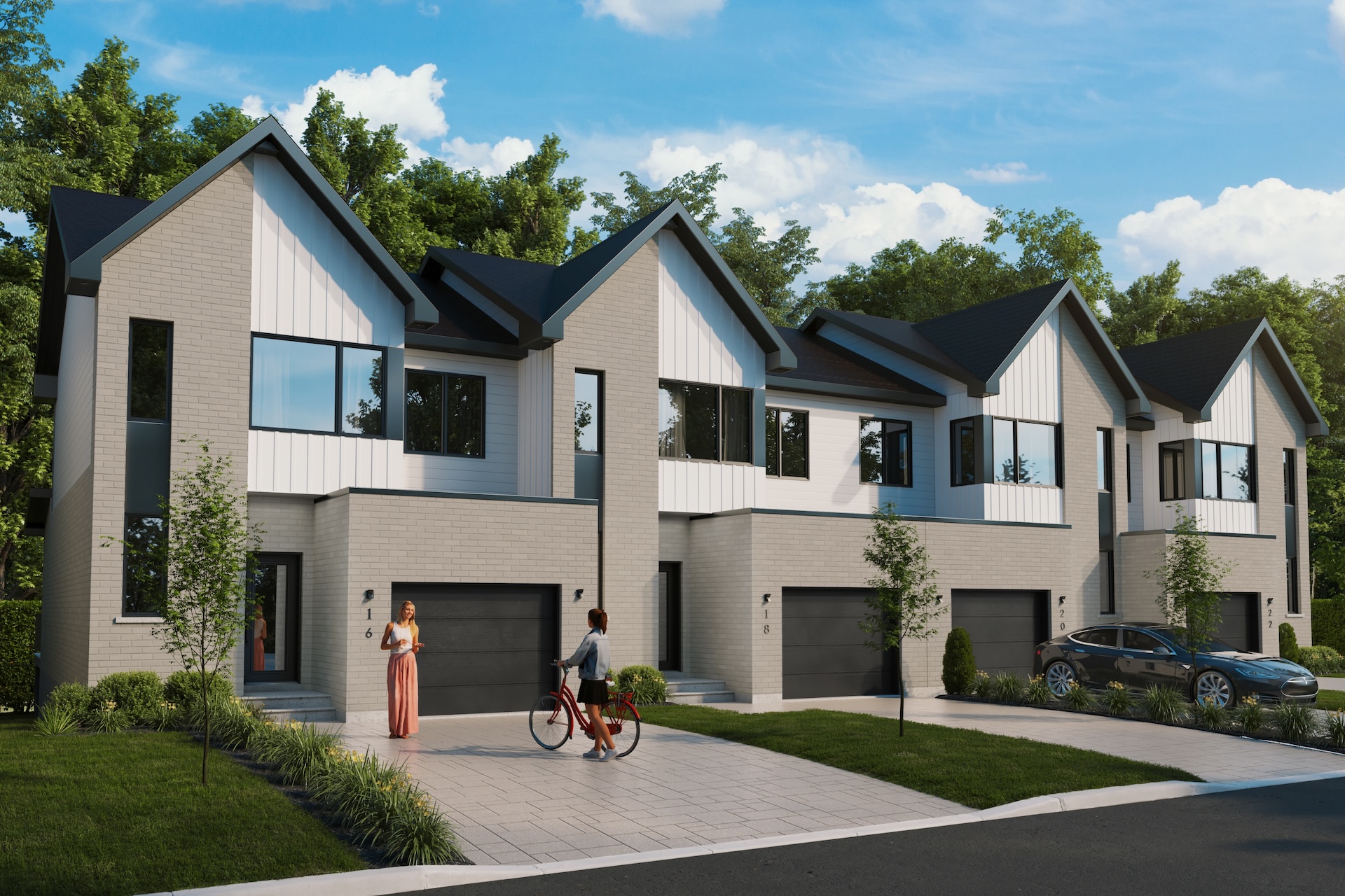Farmhouse-style townhouses in the heart of a green neighborhood