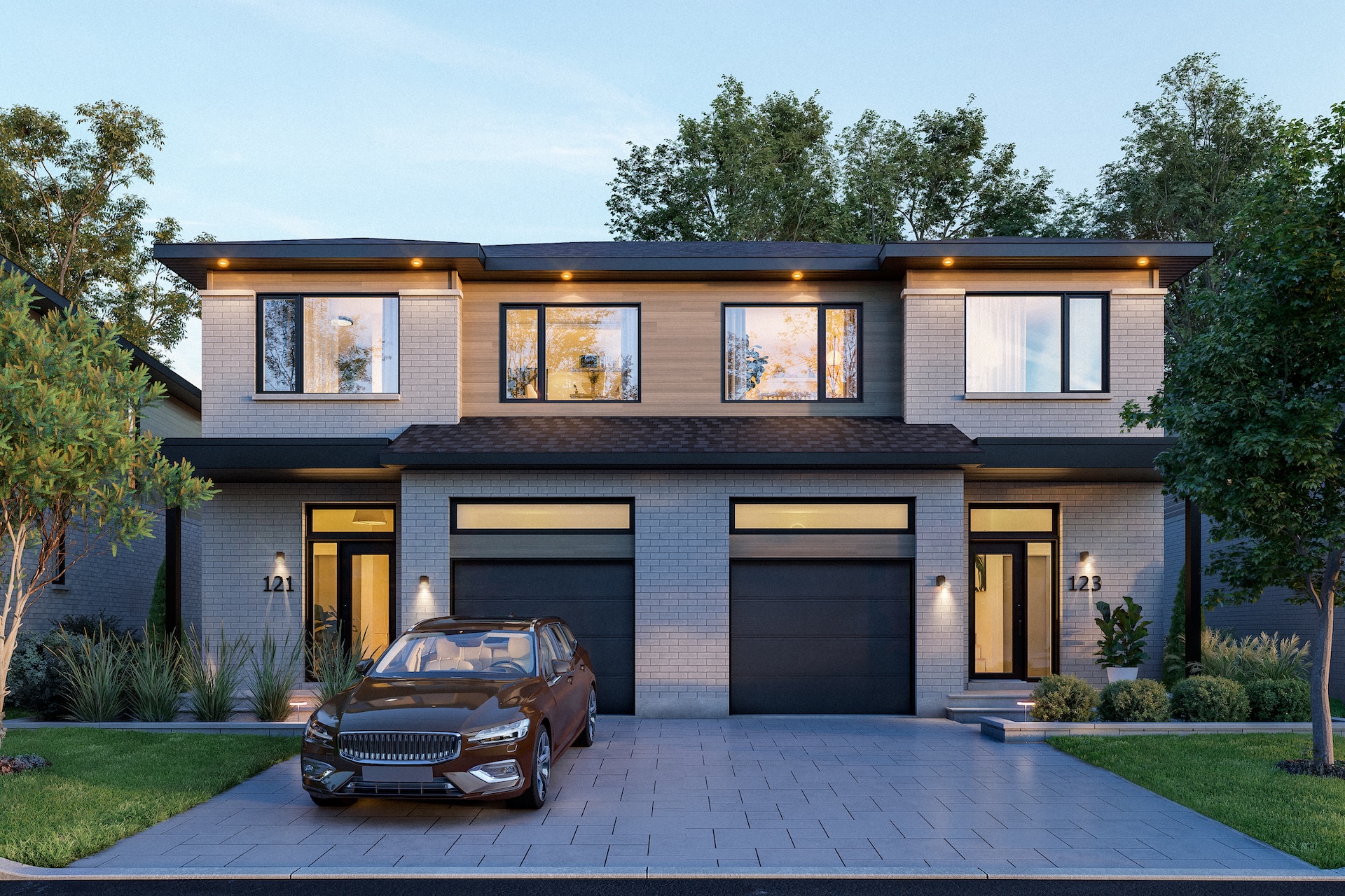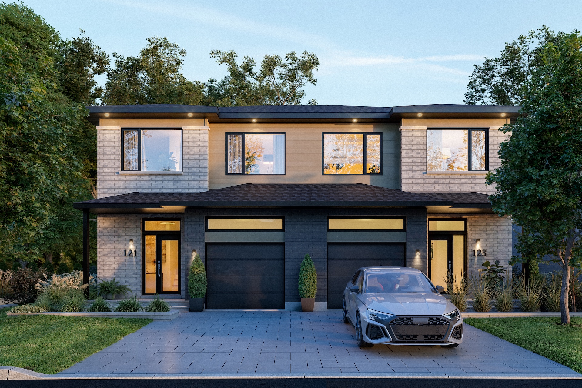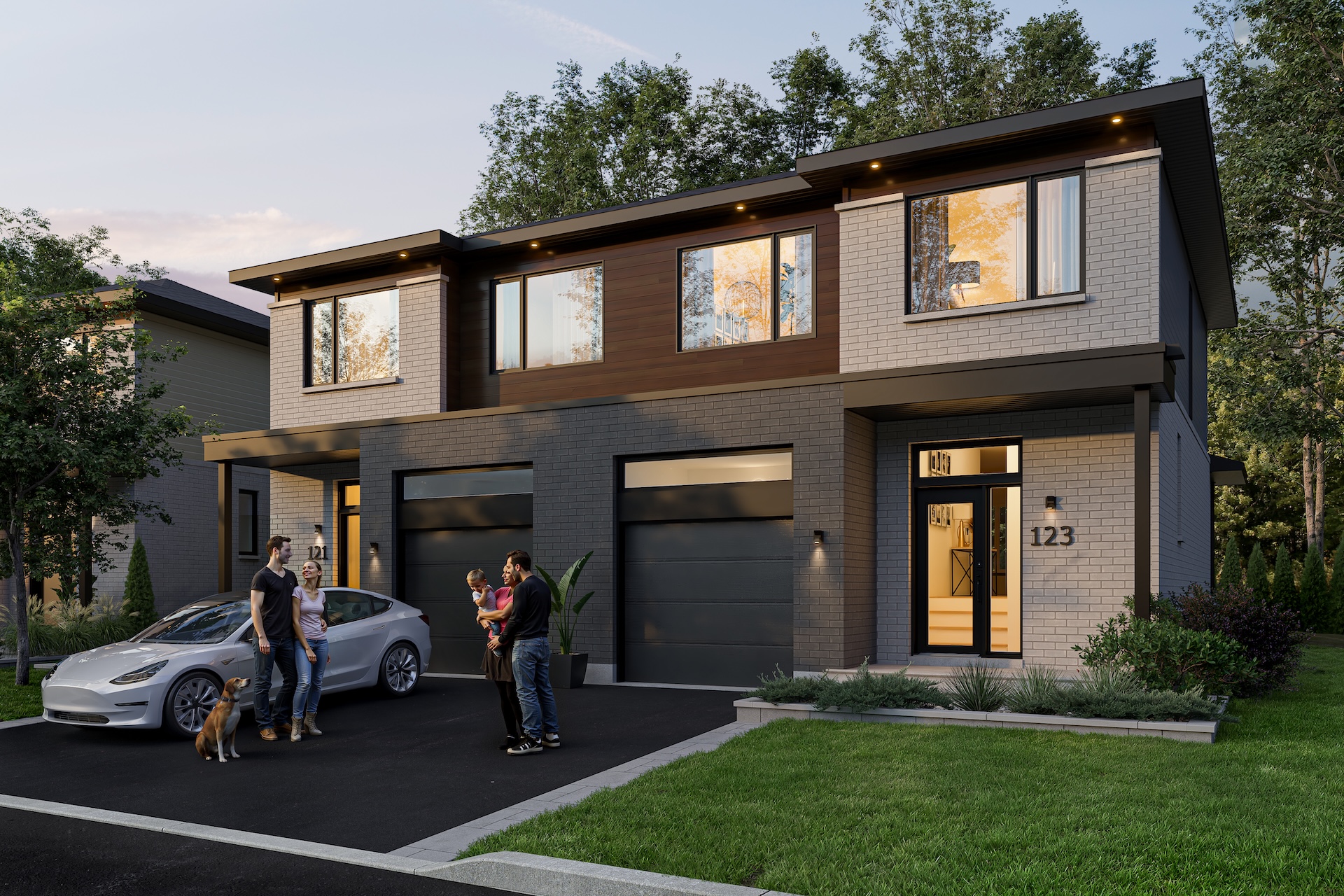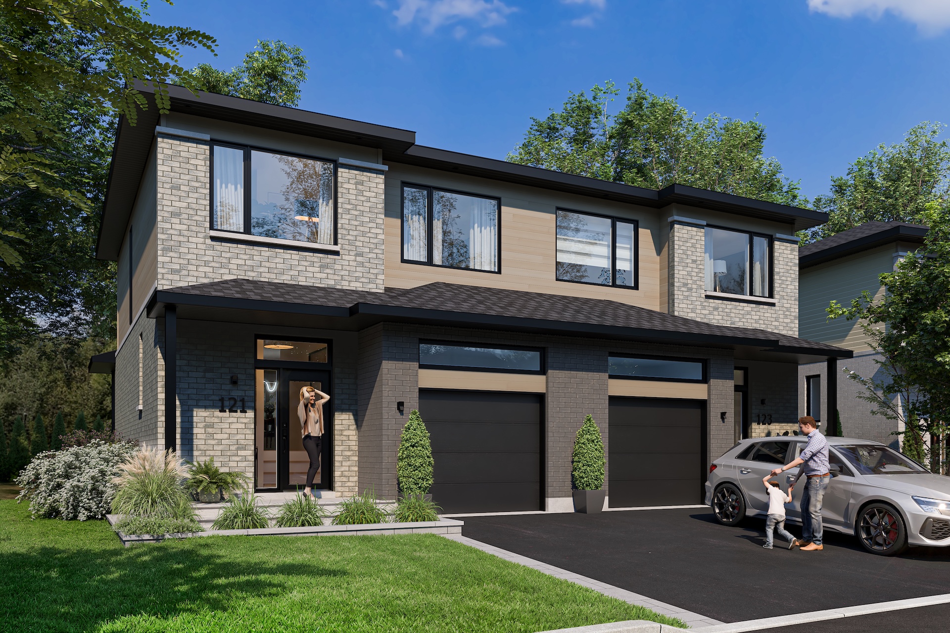The semi-detached homes at La Prairie sur le Lac can accommodate up to five bedrooms and feature high-quality materials, including hardwood floors and quartz countertops. They are distinguished by their elegant architecture, windows on three sides of the home, and bright living areas with well-balanced proportions. Several architectural styles and facades are available depending on the lot, as well as a wide range of interior configurations and customization options.