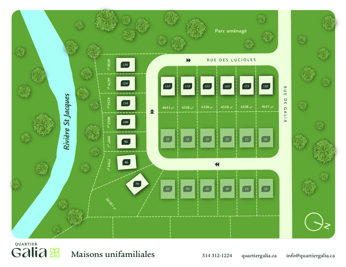 The Saint-Jacques River runs through the Galia neighborhood for approximately 2.1 km, forming a central feature of the landscape. A key element of the neighborhood, it helps to create a distinctive natural environment, where water, vegetation, and riverside areas occupy a privileged place. In tribute to its discovery by Samuel de Champlain in 1611, the development of Quartier Galia was designed with a focus on preserving and enhancing its natural environment. The neighborhood's layout promotes harmonious integration between urban planning and the richness of the riverbanks.